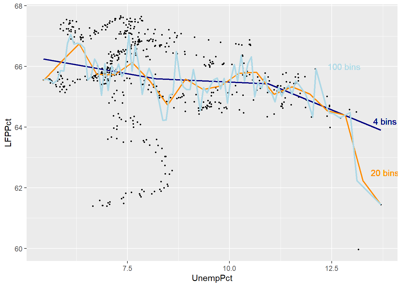 The graph below includes the original binned scatter plot based on 20 bins (orange), and adds a line based on 4 bins (dark blue) and a line based on 100 bins (light blue).