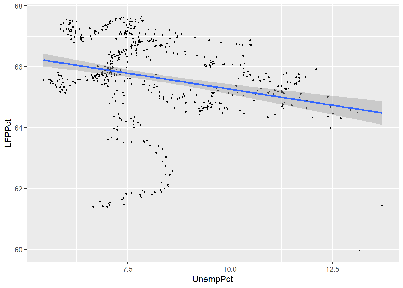 Notice that by default, the graph includes both the fitted line and a 95% confidence interval (the shaded area around the line). Also note that the confidence interval is narrow in the middle (where there is a lot of data) and wide in the ends (where there is less data).