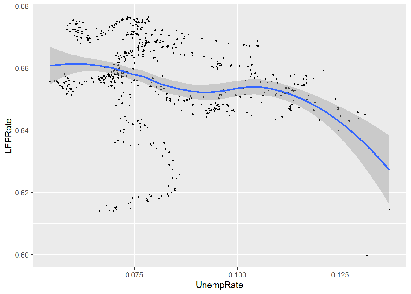 As you can see, the two fits are quite similar for unemployment rates below 12%, but diverge quite a bit above that level. This is inevitable, because the smooth fit becomes steeper, but linear fit can’t do that.