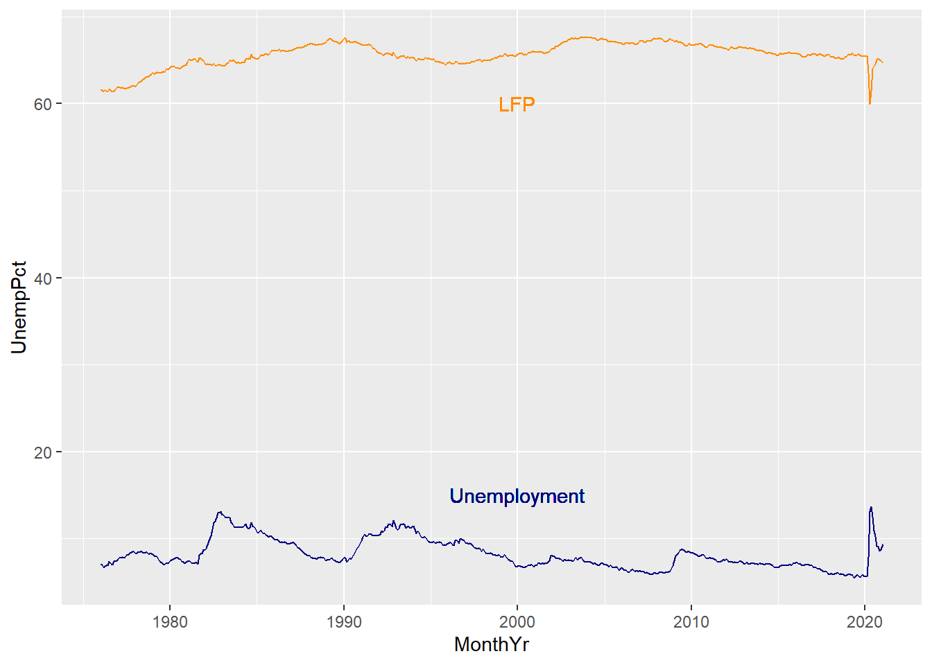 format(MonthYr, "%Y"). - Add the numeric variable EmpRate, which is the proportion of the population (Population) that is employed (Employed), also called the employment rate or employment-to-population ratio.