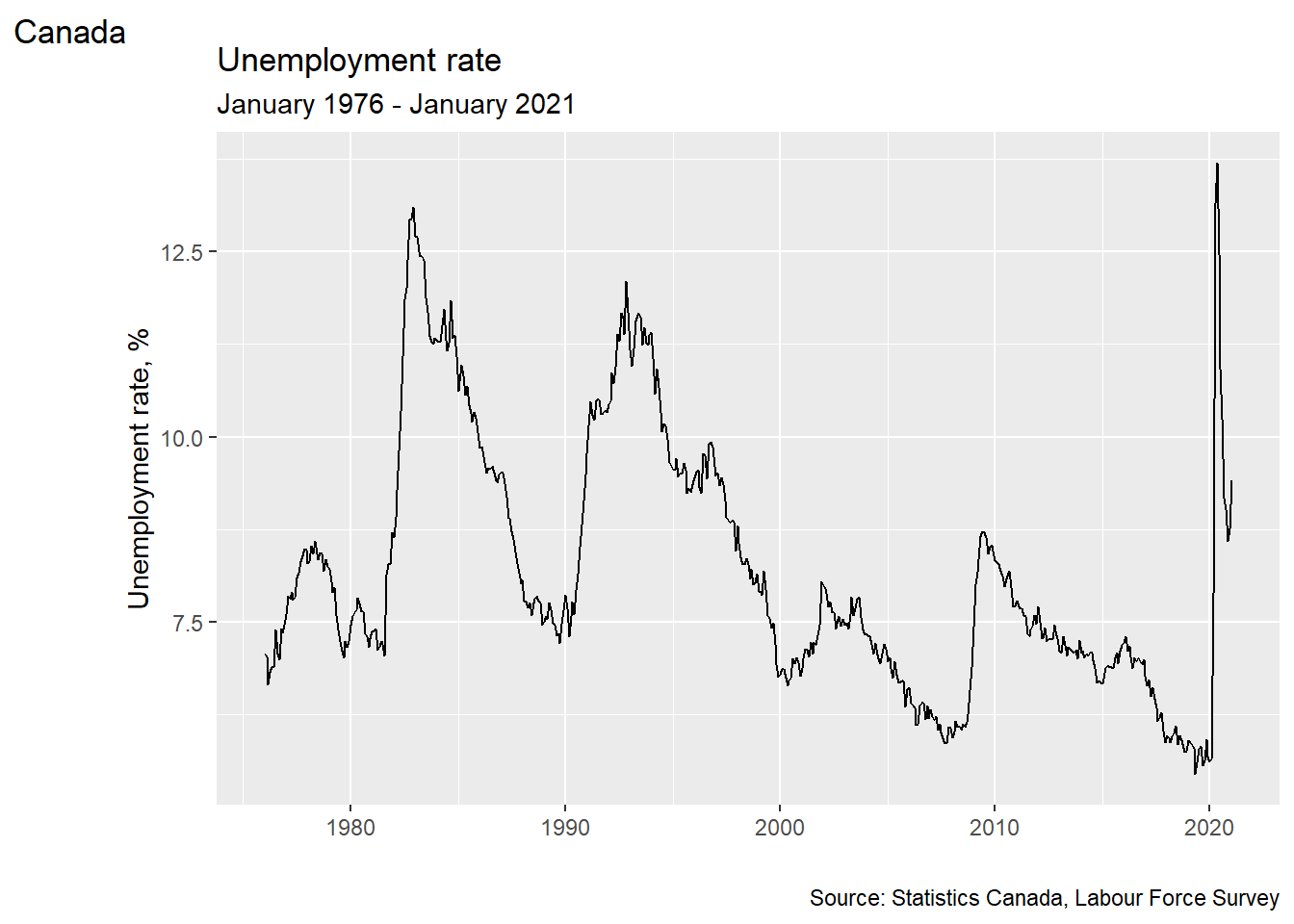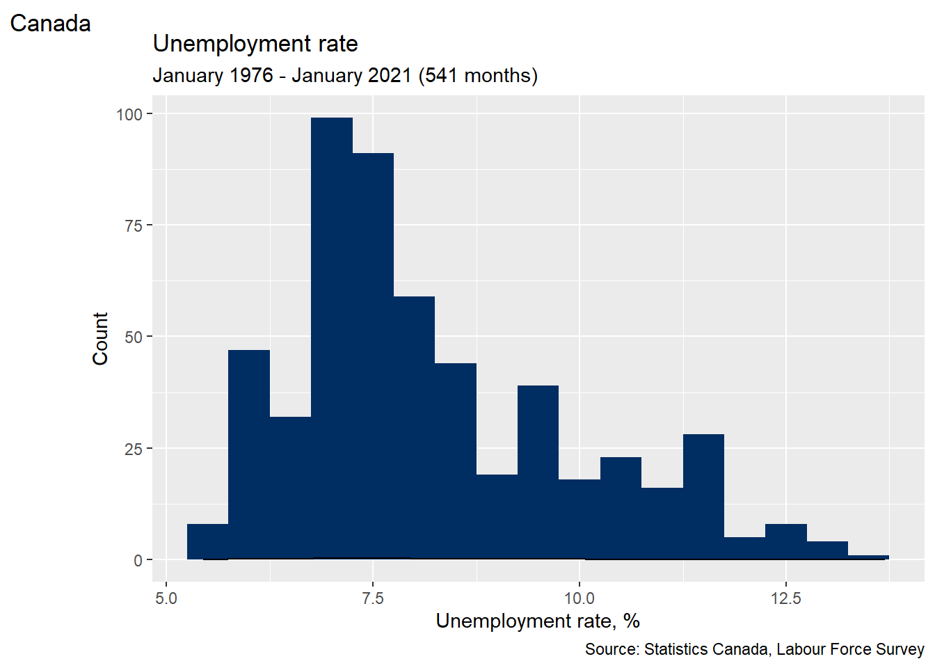 This chapter will use R to clean and analyze the historical Canadian employment data. We will also develop some simple graphical techniques in ggplot for describing the relationship between two variables, and apply them to the employment data.